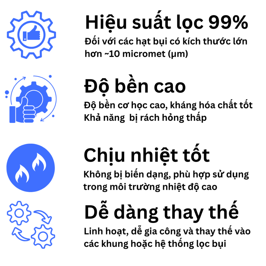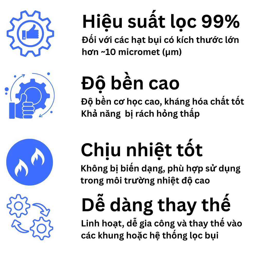 - Ưu điểm: Có độ bền cao, khả năng chống ẩm tốt, dễ dàng vệ sinh và tái sử dụng. Giá thành thường rẻ hơn so với bông lọc sợi thủy tinh. Thường được dùng để lọc bụi sơn thô, bụi không khí.
